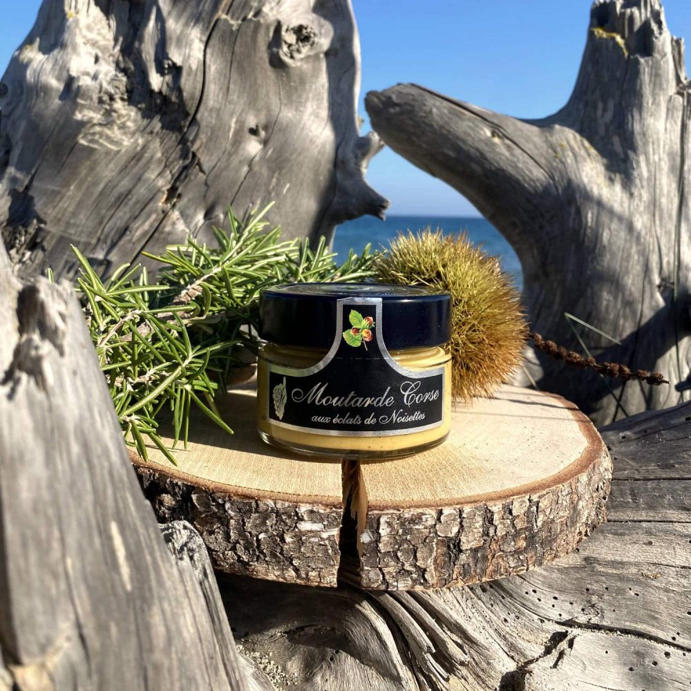 Moutarde artisanale Corse à base d’éclats de noisette de l’Atelier de la Moutarde Corse.